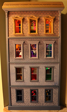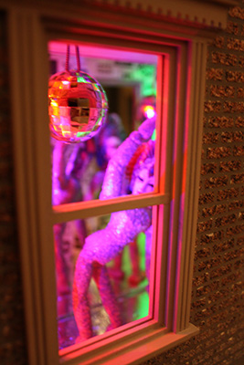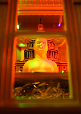 Mixed media assemblage made from plywood, wood, plastic, fix-it-all, mirrors, paper, shredded U.S. currency and acrylic paint