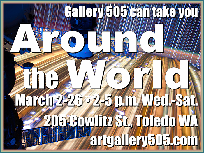 Gallery 505 travels Around the World this month with artwork by Pat Anderson, Susan Blubaugh, Jessie Camerer, Eileen Eddleman, Bob Espen, John Fish, Karen James, Curtis Johnson, Margaret Kincaid, Yvonne Mattson, Patty Misch, Di Morgan, Jake Morgan, Mike Morgan, Marti Piesch, Linda Shepherd, Janice Sutherlin, Tom Todd & Pauli Wolfe.