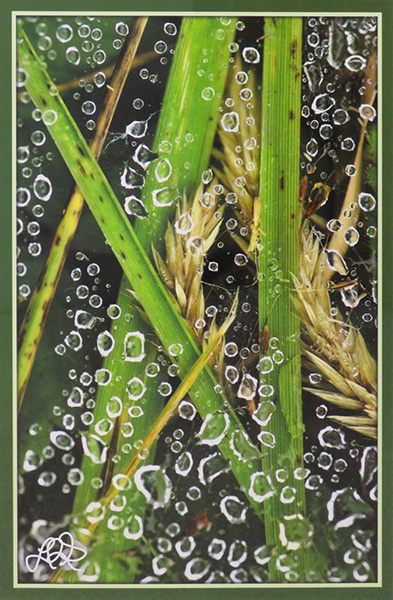 "One day, while taking a walk following a brief rain shower, I noticed how these droplets of water were suspended in a sheet web that had been spun by a grass spider."