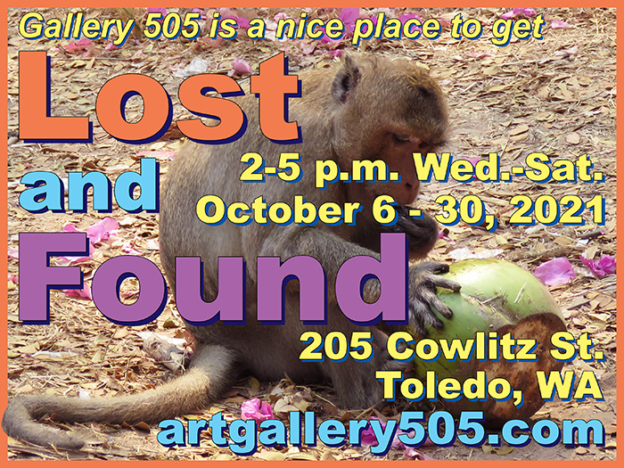 Gallery 505 is a nice place to get Lost and Found, featuring new artwork this month by Susan Blubaugh, Eileen Eddleman, Bob Espen, John Fish, Curtis Johnson, Margaret Kincaid, Tonie Knutz, Kit Metlen, Patty Misch, Di Morgan, Emily Morgan, Jake Morgan, Mike Morgan, Shauna Petty, Linda Shepherd, Janice Sutherlin, Tom Todd & Pauli Wolfe.