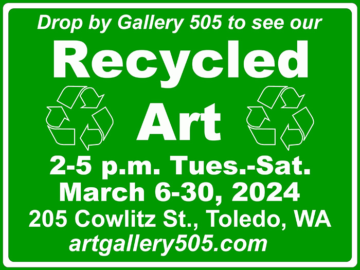 See familiar things in new ways this month. Our Recycled Art theme features creative work by local artists Pat Anderson, Lorena Birk, Susan Blubaugh, Jessie Camerer, Eileen Eddleman, Amy Eitel, Bob Espen, Leah Van Horn-Hazen, Di Morgan, Jake Morgan, Katie Morgan, Mike Morgan, Allan Penny, Richard Roth, Susan Roth, Linda Shepherd, Janice Sutherlin and Tom Todd.