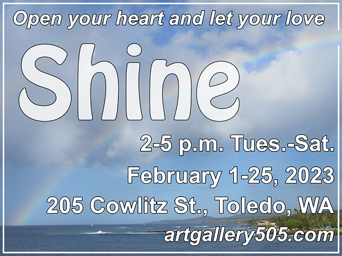 Draw your attention to things that Shine, like our collection of art this month by Pat Anderson, Susan Blubaugh, Lola Dennis, Eileen Eddleman, Bob Espen, John Fish, Karen Leback, Di Morgan, Jake Morgan, Mike Morgan, Doug Poole, Richard Roth, Susan Roth, Linda Shepherd, Janice Sutherlin, and Tom Todd.