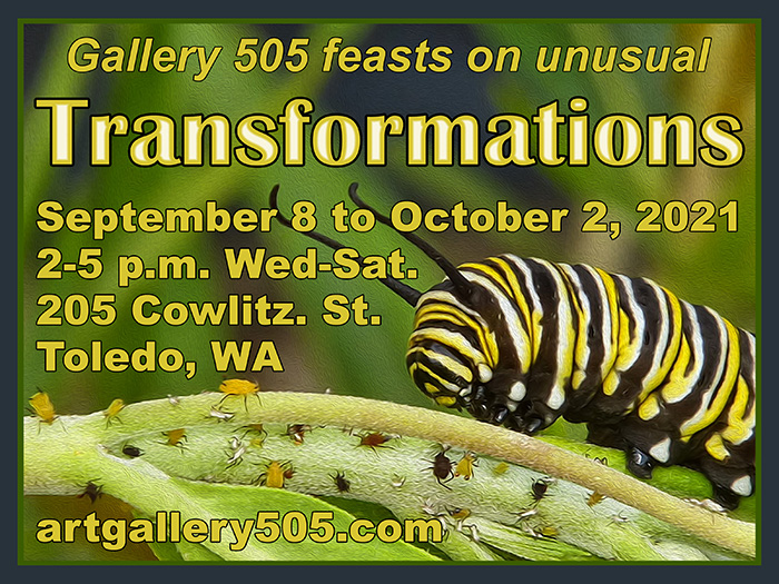 Gallery 505 considers Transformations this month, featuring artwork by Susan Blubaugh, Eileen Eddleman, Bob Espen, John Fish, Brendan Fuller, Curtis Johnson, Margaret Kincaid, Patty Misch, Di Morgan, Emily Morgan, Jake Morgan, Mike Morgan, Shauna Petty, Linda Shepherd, Janice Sutherlin & Pauli Wolfe.
